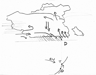 V případě střihu větru souhlasného s požadovaným směrem výstupných proudů na linii bouřek je situace asi složitější a nejsem si jist, zda se vůbec taková situace v našich podmínkách může vyskytnout. Asi by šlo o krátkodobý a limitní případ doprovázený netypicky silným směrově významným střihem větru (directional shear).
