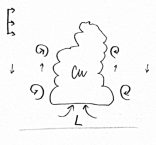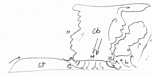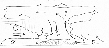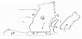 Vrátíme se teď opět k popisu vzniku bouřkové fronty. Poté, co se vytvoří oblast v bouřkové oblačnosti s jednotlivými charakteristickými oblastmi horizontální vorticity, dojde k dalšímu procesu, který dále zesiluje a udržuje bouřkovou činnost. V oblasti střední části oblaku vzniká díky specifické cirkulaci oblast s nižším tlakem vzduchu. Aby se zajistila kontinuita proudění, vzniká díky tomu další vtok vzduchu do bouře (detailně zobrazují obrázky č. 6). Tentokrát však z opačného směru. Vzduch vtahovaný ze zadní strany má jiné vlastnosti než ten, který se soustředí před bouřkou. Je studený a obyčejně sušší. Vzduch se dostává do středních částí oblaku a ještě více stabilizuje zvrstvení. Přes tuto vrstvu propadají převážně stratiformní srážky z vyšších částí oblaku a částečně se vypařují a prochlazují jezero chladného vzduchu.